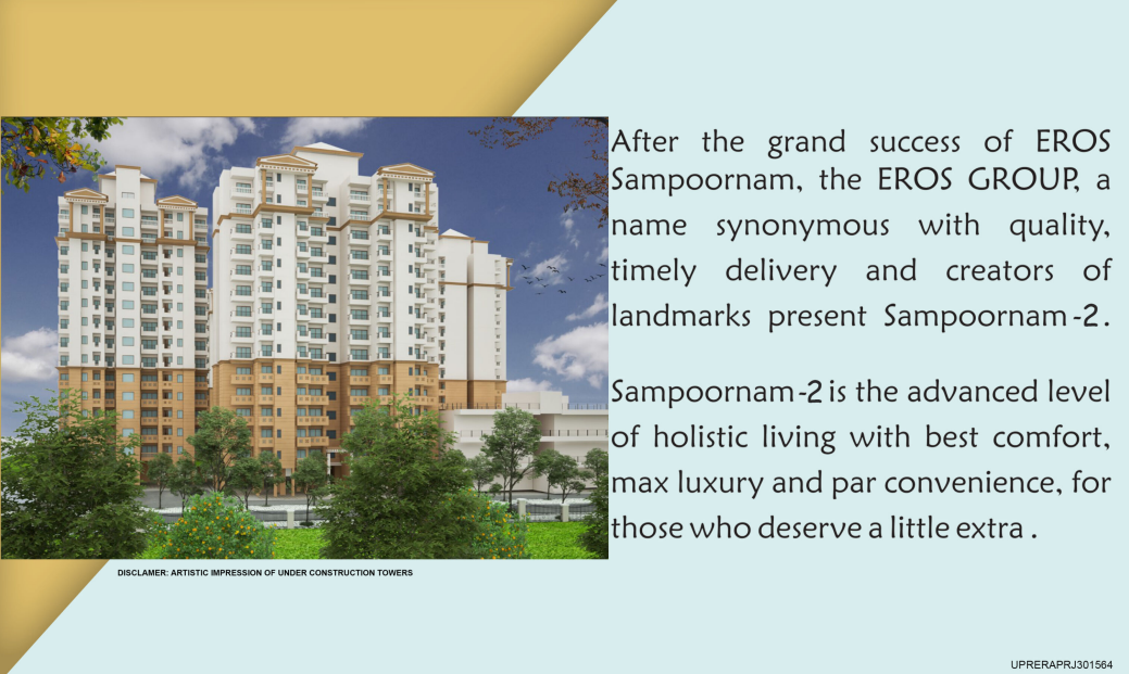 Make the most of this life- grow by leaps and bounds- Check out Eros Sampoornam Phase 2- you will have a great living experience at this premium space! The development is located in Sector 2, Greater Noida West! It is offering 3 BHK Homes -1350 to 1800 Sq. Ft- and 2 BHK Homes 835 Sq. Ft. with great sizes for all. The development is a great place with all the modern amenities. It is a perfect place for living if you are looking for a family home!